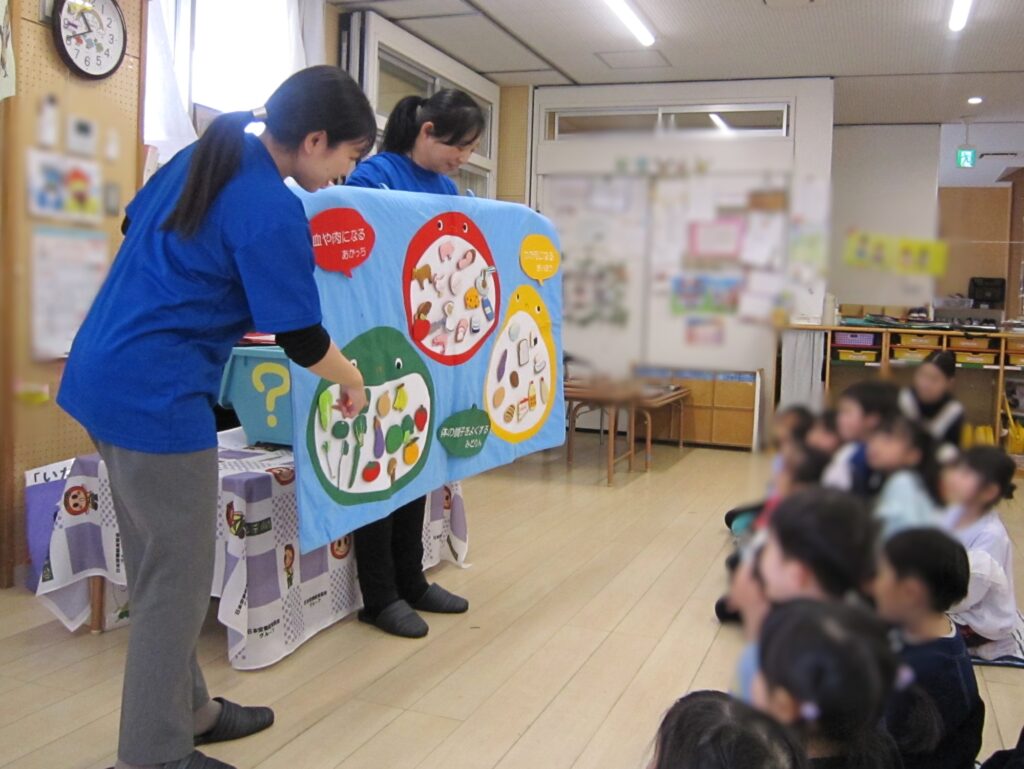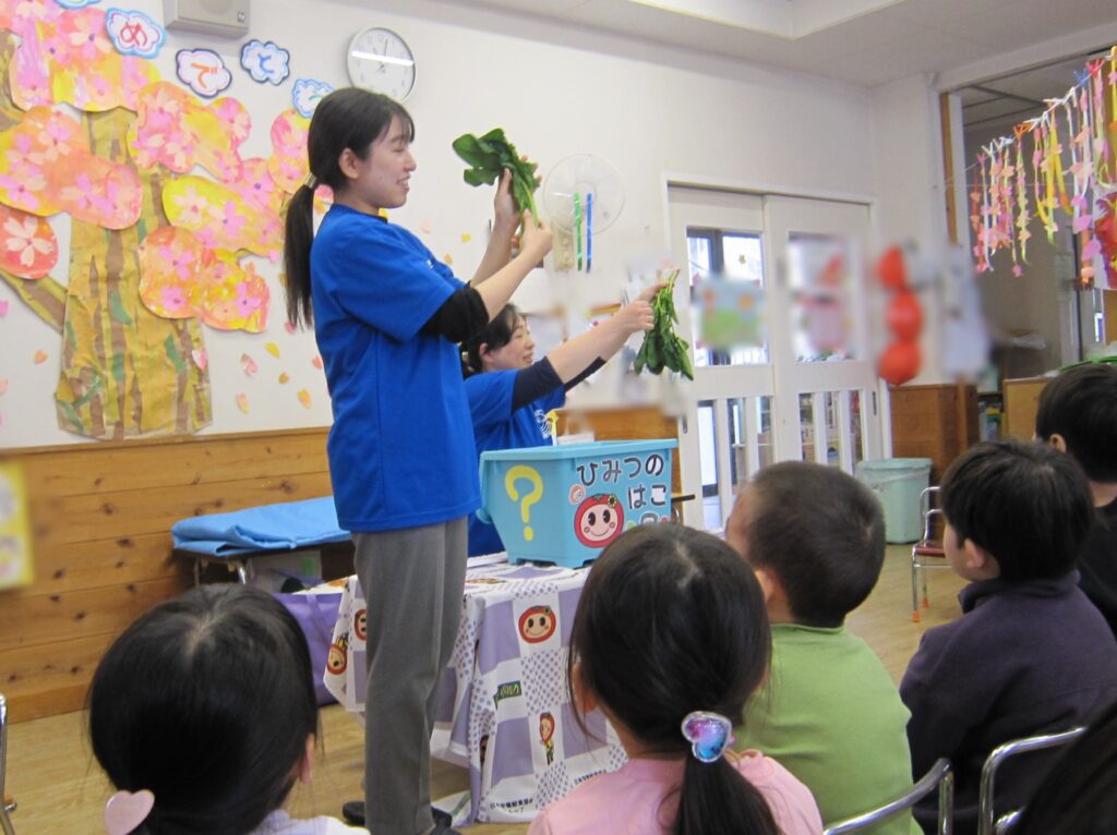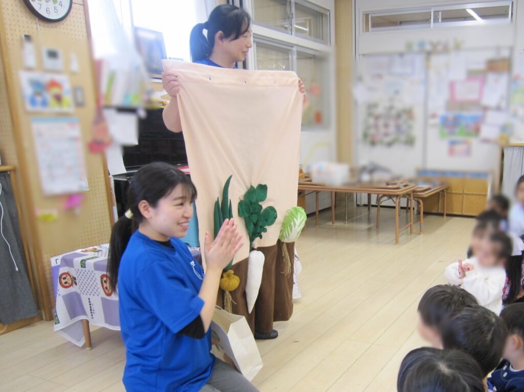 野菜の名前当てクイズや3色の栄養素のお話のほか、年少クラス・年中クラスに合わせたお話をしました。